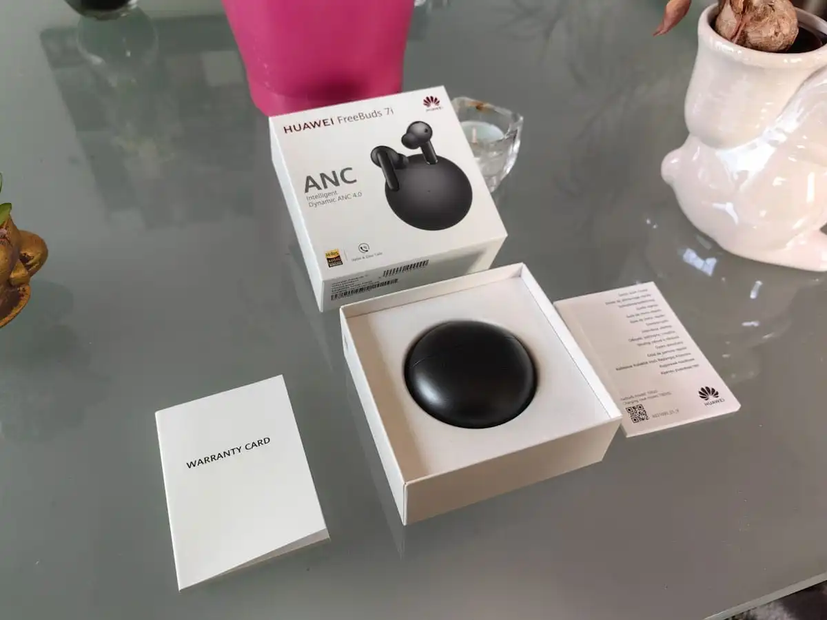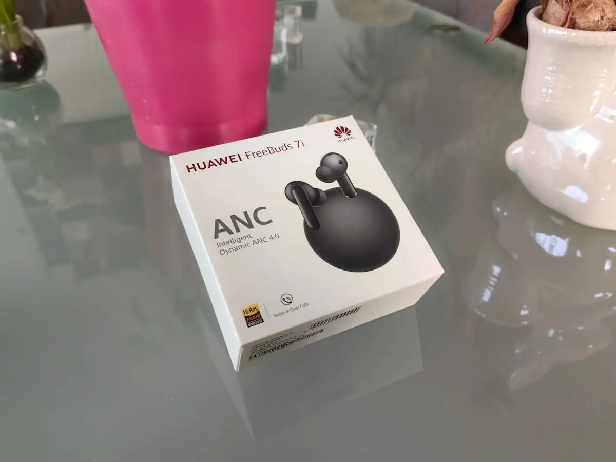 Die HUAWEI FreeBuds 7i werden in einer HUAWEI-typischen Verpackung geliefert: kompakt, schlicht in Weiß gehalten und verziert mit einem Abbild der Ohrhörer sowie den wichtigsten technischen Daten.